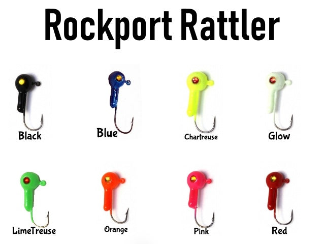 The Rockport Rattler jig combines sound, color, and light reflecting eyes that gives every angler that uses it an advantage over an angler using a conventional jig or screw lock jig that doesn't make noise. Using a sharp Aberdeen style hook for good hook sets. No worrying about the rattle, its built into the jig head itself.